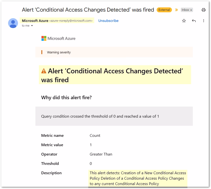 - Description: Alerts whenever a CA policy is added, modified, or deleted