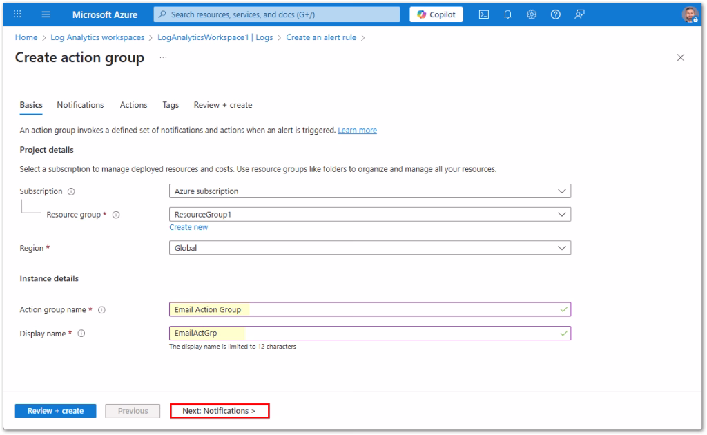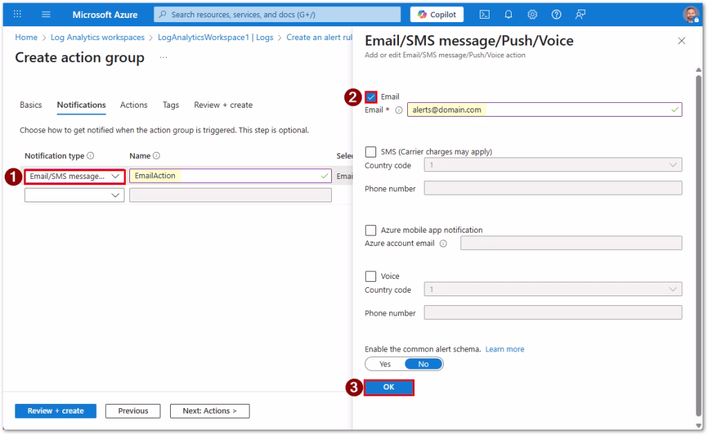 - If results are found, an alert fires through an Action Group (email, Teams, SMS, webhook, etc).