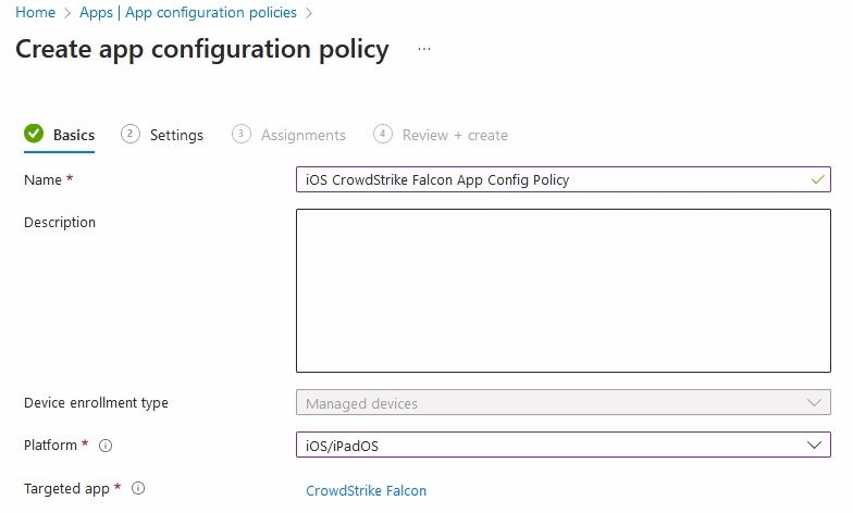 3. Create a Configuration Policy for Managed Devices. Name it “iOS CrowdStrike Falcon App Config Policy”: